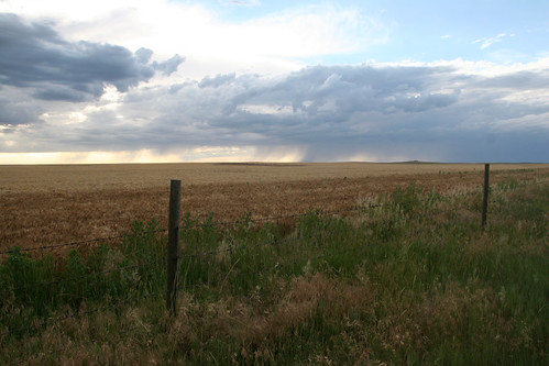 The wheat is looking good in Genoa- what little we cut of it. Yield was ranging from 35 to 40 bu. / ac. while moisture was barely where it needed to be for the elevator’s requirement of 13.5%. We have yet to dump a load, so we have only just begun here in Limon……. We were only able to start cutting at suppertime and were rained out not even an hour later.