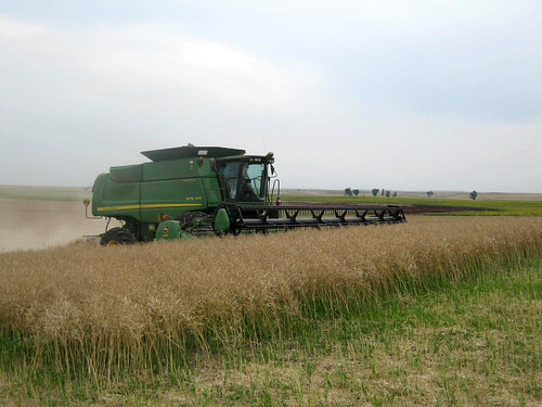 A lot of the wheat is still changing. Here is a photo of some wheat yet to be harvested. If you look closely, you can see there are still quite a few green heads in the field. You might be asking how can some wheat be ready to cut while another field is so green still? The answer is the weather. The spring was wet making rough conditions for farmers to get their crops in. Some fields are behind because of a waiting period inflicted by rainy weather while some were re-seeded after floods prevented the crop from growing. There can also be quite a difference in yields in the area. For instance, one field can be yielding 40 bu/ac versus while a neighboring field is yielding only in the teens. The only explanation can be the varieties used. Normally conditions are dryer here so farmers typically use varieties that grow better in dryer settings. The weather with the combination of these types of varieties explain the low yields some farmers are receiving.