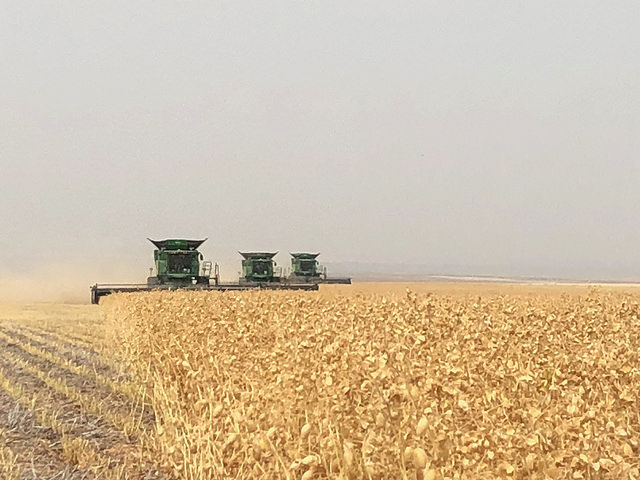 Great Falls, Montana – Our crew out in Montana is keeping busy cutting chickpeas and so far so good JC says. The chickpeas are easy cutting and they are making harvest progress. They are yielding in the 40s and they are dry. They also had Canada fires heavy smoke in the air for several days. Once they finish chickpeas they’ll cut barley.