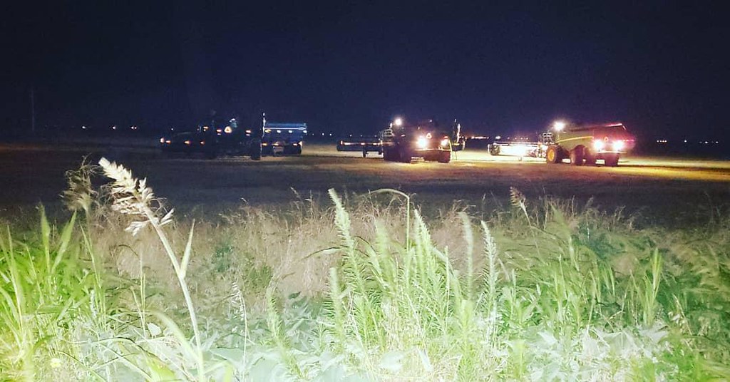 We’ve been working til midnight lately. The breeze picks up after dark allowing us to cut later. Mother Nature bring it on! I love getting the opportunity to work late! It doesn’t happen often enough in my opinion. It seems like we’ve been here at our first stop for a long time. The rain delays and cooler temperatures have delayed harvest. However, it finally feels like harvest is in full swing. We go to the field at 7 a.m. to service the combines. I always get dirty and covered in itchy chaff. We fuel, grease and blow the combines and headers off and fix sickle sections and whatever else needs to be done. I wash a lot of cab windows too. It’s all part of being a harvester.