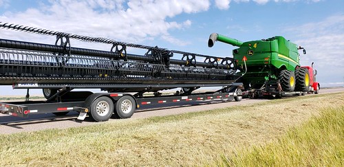 The wheat has been making over 70 bushels per acre and the test weights are over 60 pounds per bushel. We’ve been using our pickup headers to harvest the winter wheat. One reason it is swathed is because of sawfly disease. The fields are big and everyone involved keeps busy. Our next field is a big one. It’s 1,358 acres. Our forecast is hot and dry so we’ll be busy here for a while. I hadn’t used my pickup header in a few years. I did a lot of picking up swaths in South Dakota and North Dakota when I was a teenager and in my early twenties so this reminds me of that a lot. In fact, we used to load the combines up with the pickup headers on them when we cut in the Dakotas. This is back when combines were hauled behind a straight truck. Things change over time though.