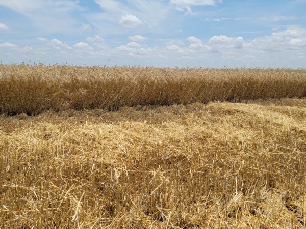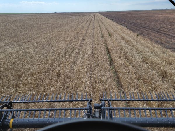 We can’t use the tractor grain cart on this field because of the cotton stalks. They will go right through the tires. I love cutting wheat but I am miserable cutting cotton stalks.