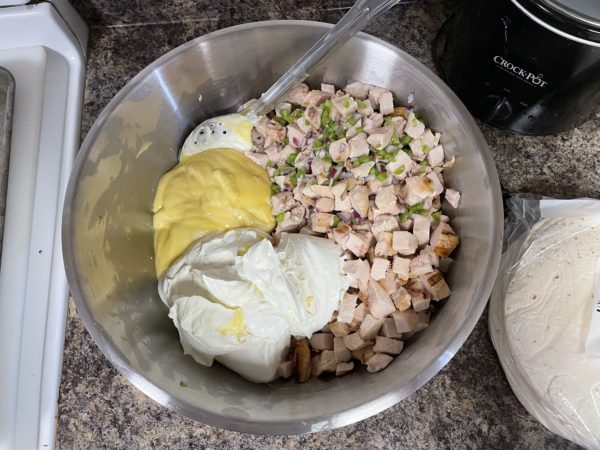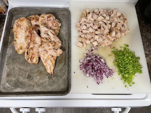 Today, I’m cooking for 16 people. I cooked about 10 chicken breasts on the grill. I’ll cube the chicken and chop up onion and green pepper.