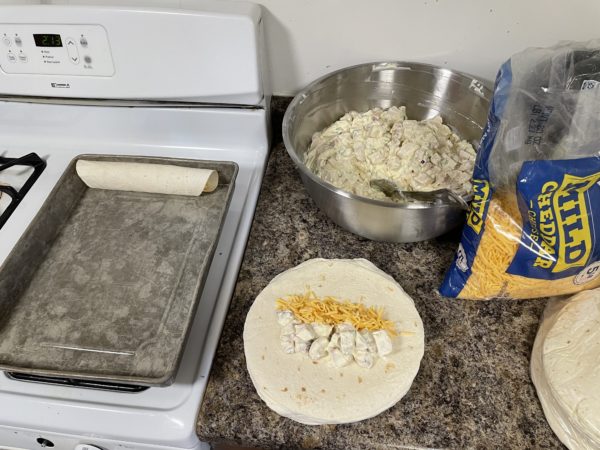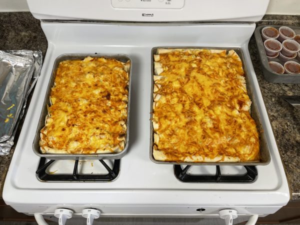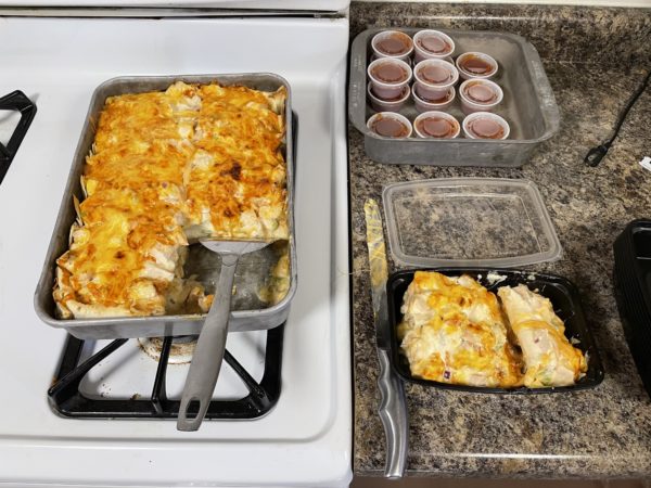 After cooking, I usually cut the enchiladas down the center in order to easily scoop up and package into a reusable container. I serve these with a roll and sometimes a lettuce salad. I’ll dish up taco sauce to hand out as well. I didn’t get the lettuce salad done today, so this will conclude supper for tonight.