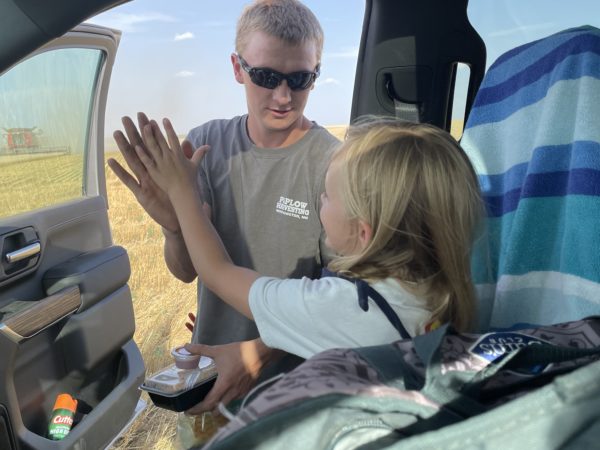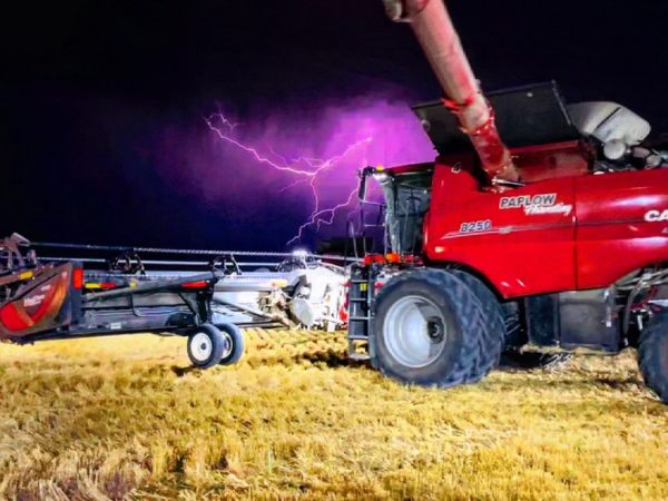 We’ve been cutting over by Sheridan Lake, Colorado. While they had power loss during the same storm, they weren’t hit quite as bad as Towner. One of our grain cart operators, Dillon Grutkoski, caught a pretty neat picture of the lightning while they were scrambling to get out of the field before the roads turned impassable. As it was, the fuel trailer and dually about spent the night in the ditch. I’m thankful they were able to make it out and back to Tribune safely.