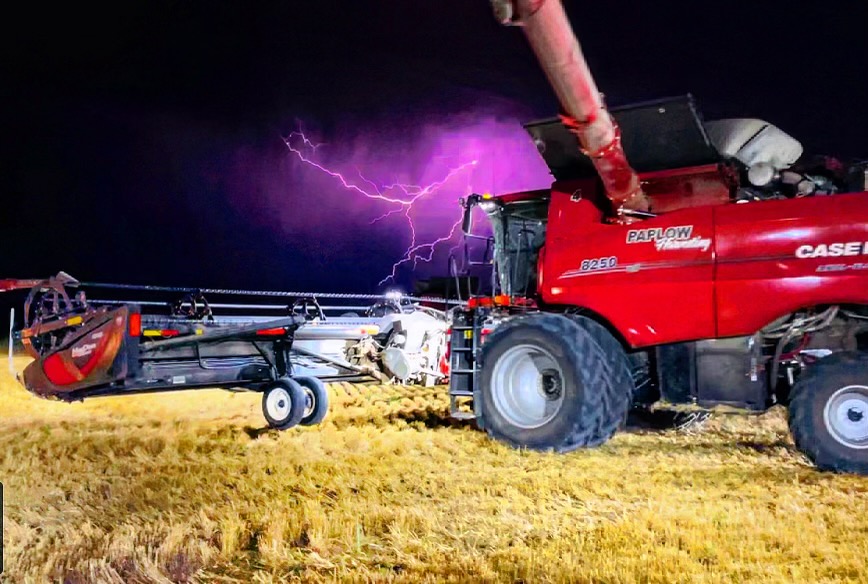 We’ve been cutting over by Sheridan Lake, Colorado. While they had power loss during the same storm, they weren’t hit quite as bad as Towner. One of our grain cart operators, Dillon Grutkoski, caught a pretty neat picture of the lightning while they were scrambling to get out of the field before the roads turned impassable. As it was, the fuel trailer and dually about spent the night in the ditch. I’m thankful they were able to make it out and back to Tribune safely.