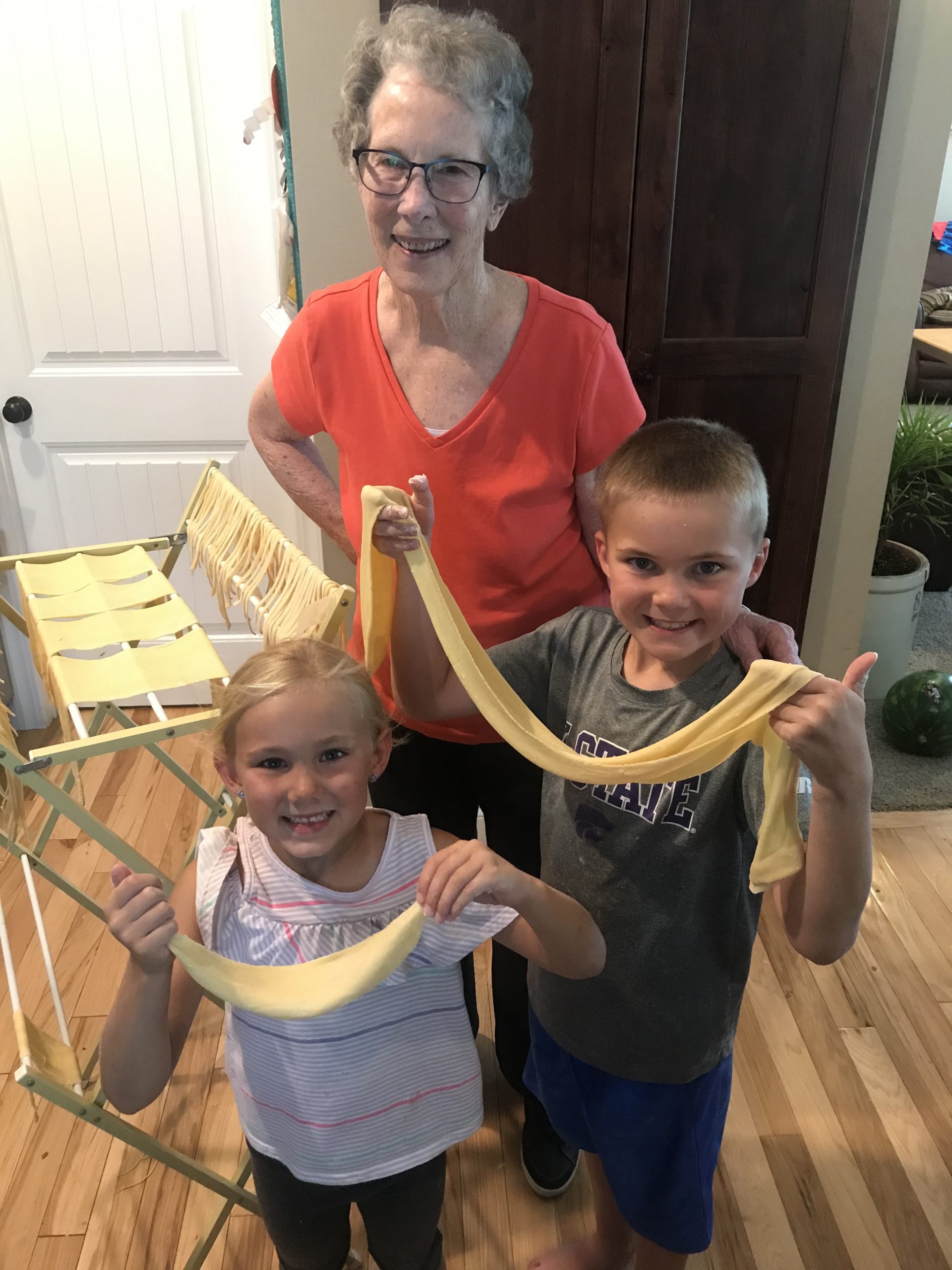 On July 1, the kids were thrilled to able to share their act of love with the crew, in the form of homemade chicken noodle soup. Now normally, that would sound like a terrible meal for that time of year, but with slightly overcast skies and unseasonably cool temps, it worked. My mother-in-law used to have a noodle making business called “Donna’s Noodles.” For years I’ve been wanting to learn to make them. We finally made that happen while we were home, briefly. She taught us her recipe and how to use the noodle machine. It was such a special time of bonding.