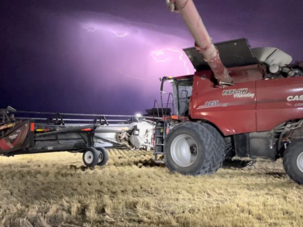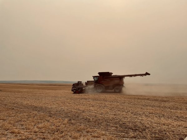 Bright and early the guys got everything unloaded and ready to cut. We brought five machines up to start, and spent the first day cutting a 470-acre field of peas. They averaged about 15 bushels per acre. The dry, hot weather didn’t help yields in this field. It was really dusty and hazy out while cutting.