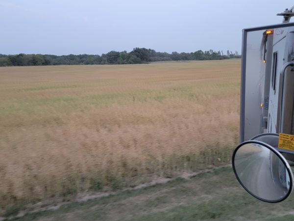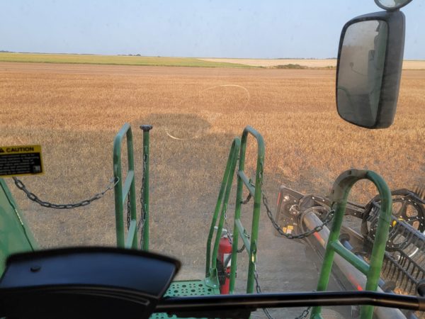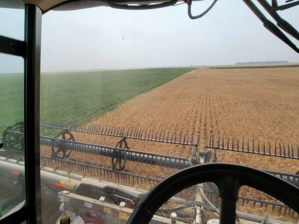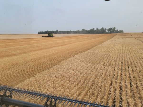 A lot of wheat got cut in this area last week. Several harvesters are not here yet. We got here right on time and went straight to the field and had pretty good going until we got rained out. It’s been a fast North Dakota harvest so far. The conditions have been hot and dry here and it’s been an unusually fast harvest in North Dakota.