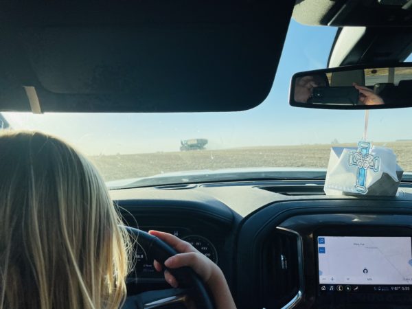 While delivering meals to the field, Zoey is learning how to drive a pickup. I’ve been working with her on how to steer, and she’s now using the foot pedals, too. The more experience she gains, even though only in the field, will hopefully help her to be a good driver when she is out on her own. I asked her since she’s learning the pickup, if the tractor would be next. Her reply, “Nope. I’m going to drive combine.” We’ll see what she says when she’s older, but I know it would make Paul and myself pretty proud to see her running a machine. That’s a little ways off now, but her interest in driving is a good start.