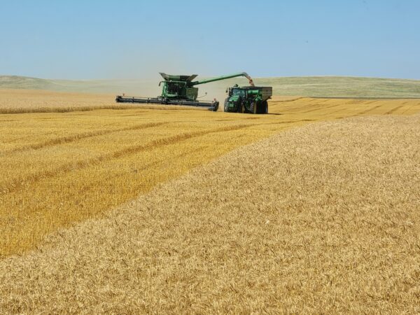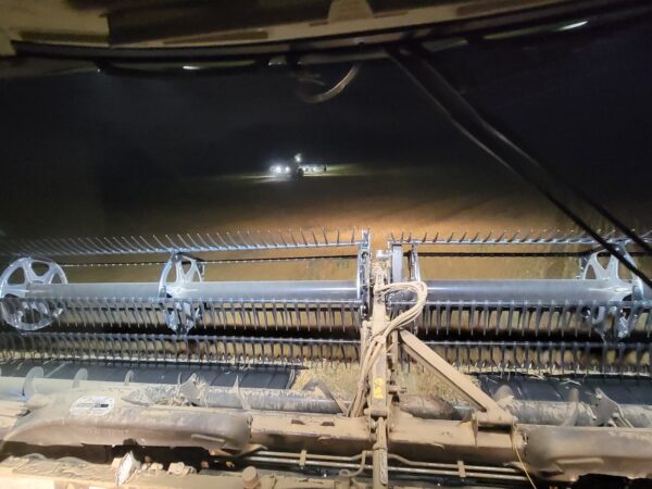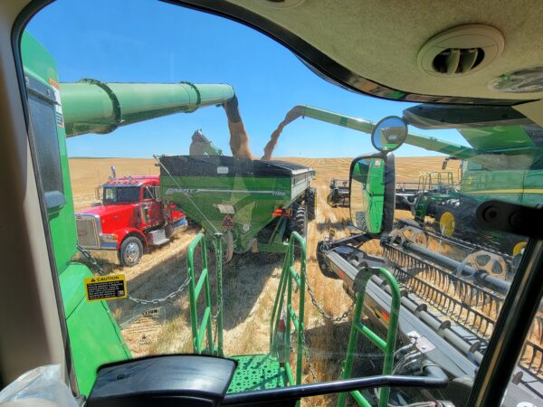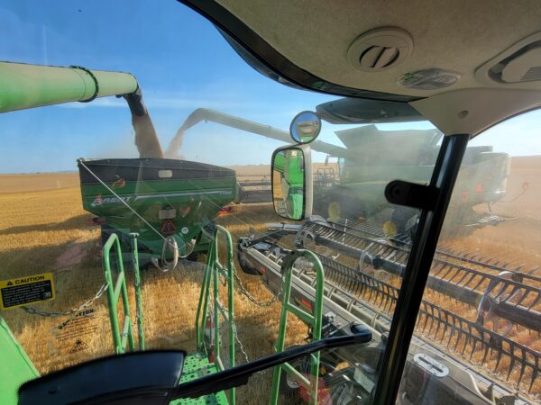 We unloaded equipment, looked at fields and started on a full section of wheat. We took a sample to town and it wasn’t quite dry enough, we waited a few hours and sampled again and it was dry. We arrived right on time and have been staying very busy cutting spring wheat. It’s yielding 50 to 70 bushels per acre. The test weights have been just under 60 pounds per bushel and the protein around 14%.