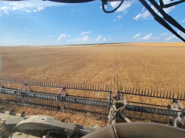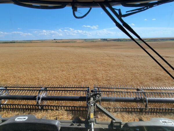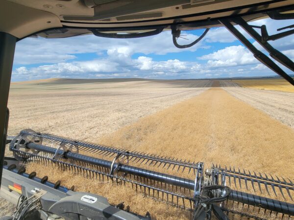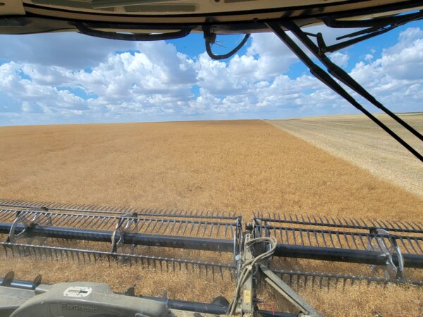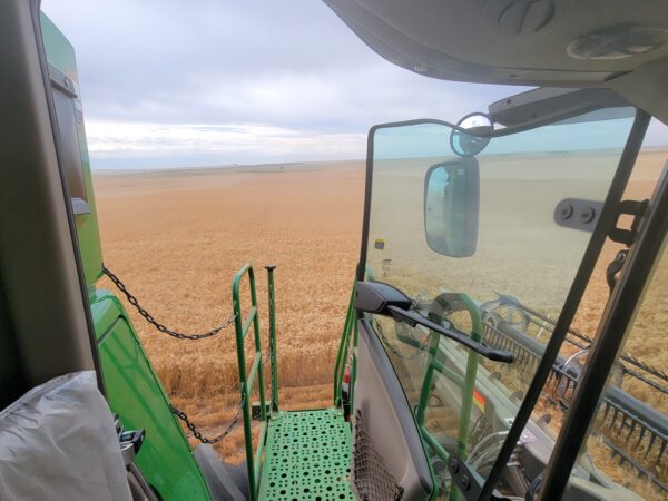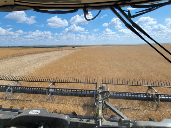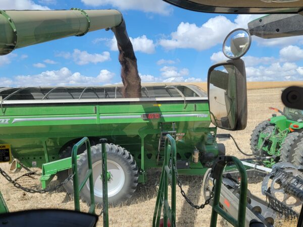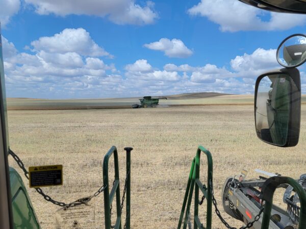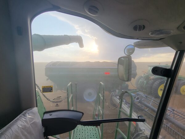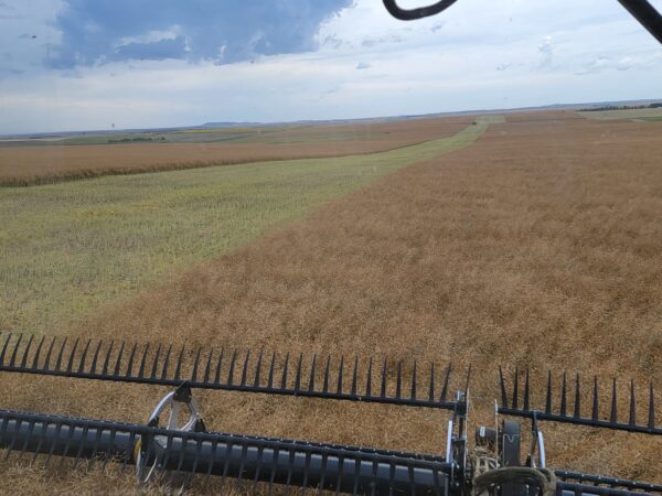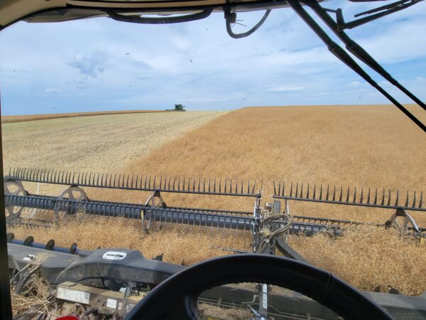 Southwestern North Dakota—When the weather is good, North Dakota is a really amazing place to harvest. We’ve been staying busy cutting spring wheat and canola. The spring wheat has been yielding 50 to 70 bushels per acre. The test weights have been around 60 pounds per bushel. The day we got started on canola the weather looked like rain. We had a dark sky and rain clouds but luckily got to keep on cutting as the rain went around us. The canola is yielding 1,500 to 1,900 pounds per acre (below average due to heat and drought stress). I enjoy cutting canola and got to demonstrate canola harvesting on my AAWH Facebook Live video on Aug. 19. I had 10,000 views within a day.