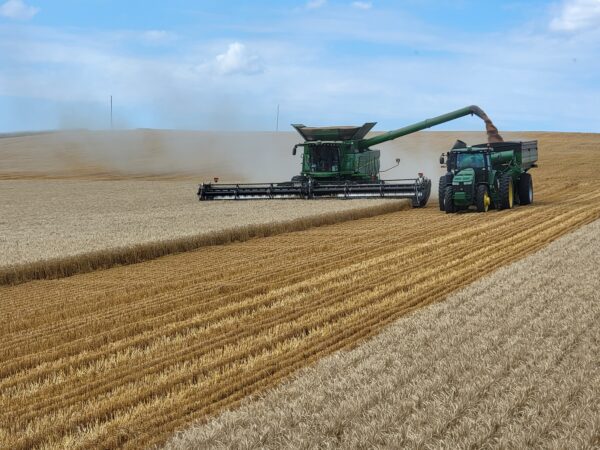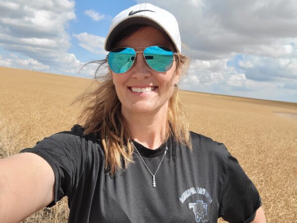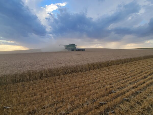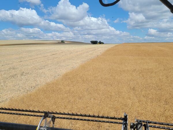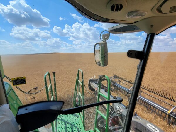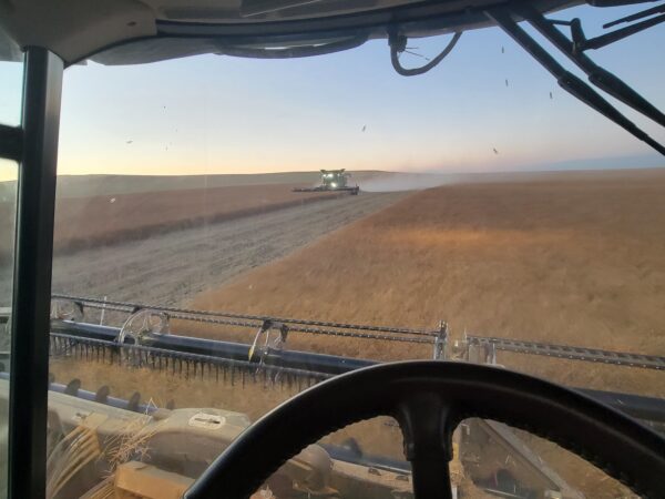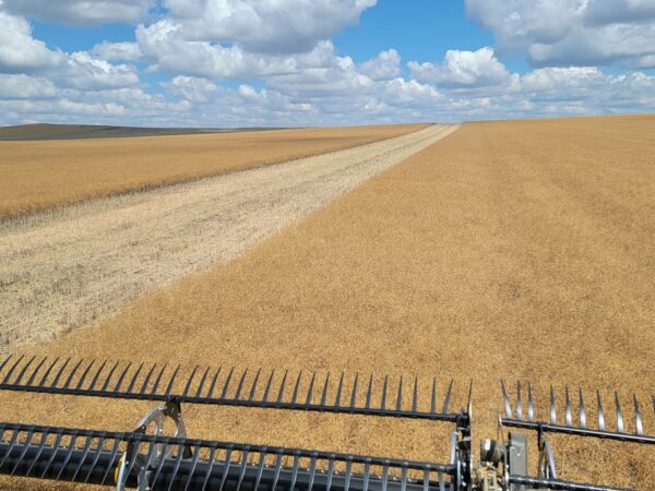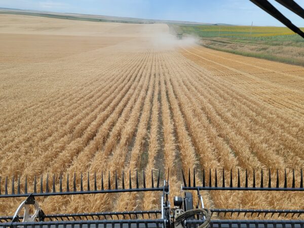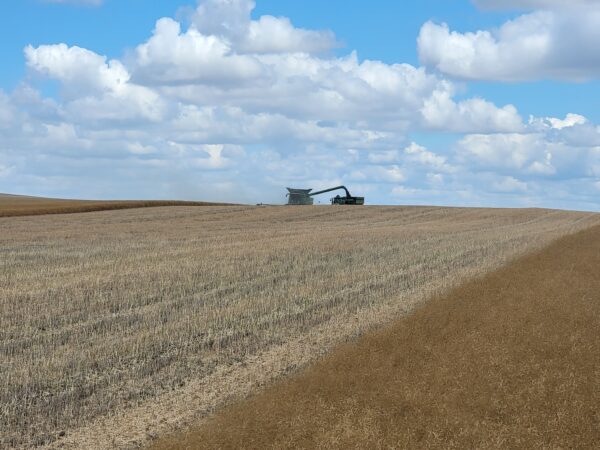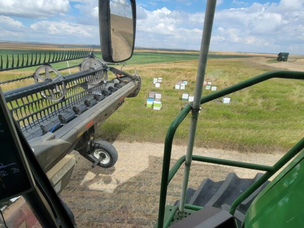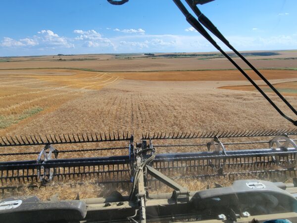 Southwestern North Dakota—When the weather is good, North Dakota is a really amazing place to harvest. We’ve been staying busy cutting spring wheat and canola. The spring wheat has been yielding 50 to 70 bushels per acre. The test weights have been around 60 pounds per bushel. The day we got started on canola the weather looked like rain. We had a dark sky and rain clouds but luckily got to keep on cutting as the rain went around us. The canola is yielding 1,500 to 1,900 pounds per acre (below average due to heat and drought stress). I enjoy cutting canola and got to demonstrate canola harvesting on my AAWH Facebook Live video on Aug. 19. I had 10,000 views within a day.