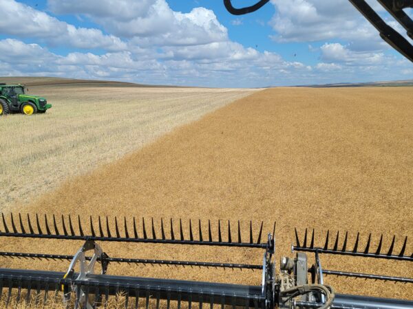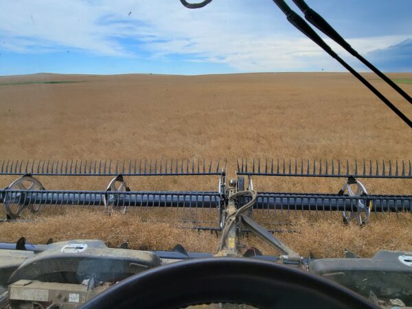 We have spring wheat and canola to cut. There are chances of rain in the forecast Monday through Friday. Jared and Lonny are cutting spring wheat in Montana and JC is still working on chickpeas. Today is Aug. 21 and summer harvest is getting closer to the end. However, there are a lot of green crops around yet. The weather is supposed to continue to be hot in the 80s and 90s so that’ll help ripen the crops.
