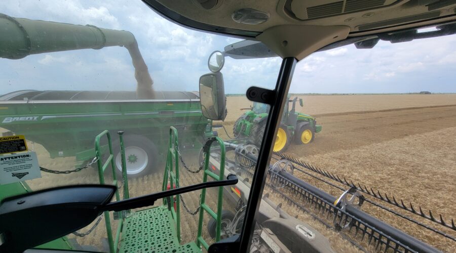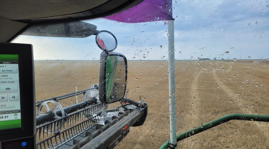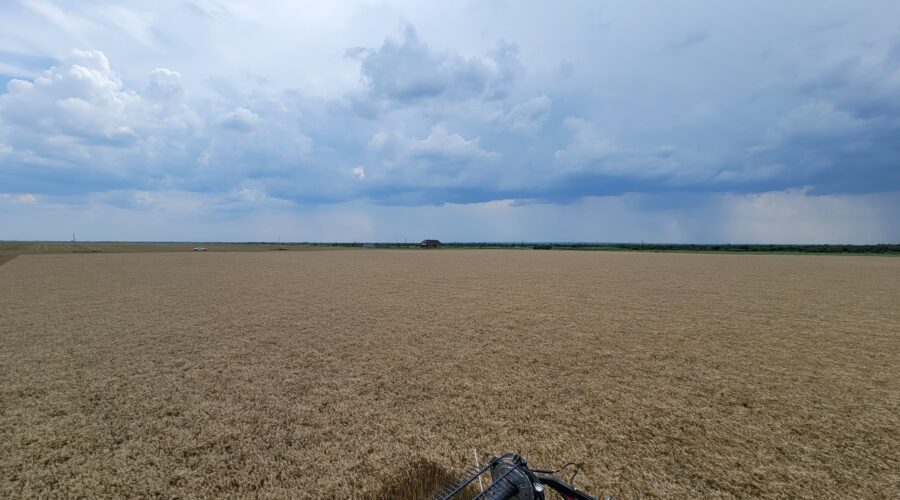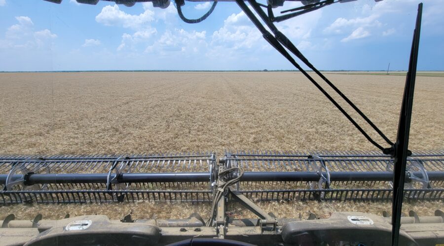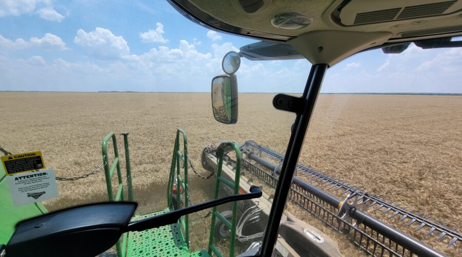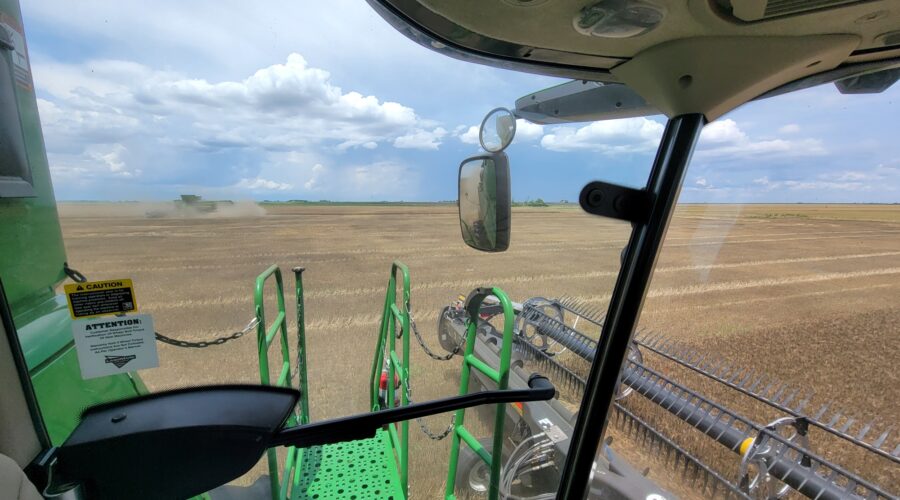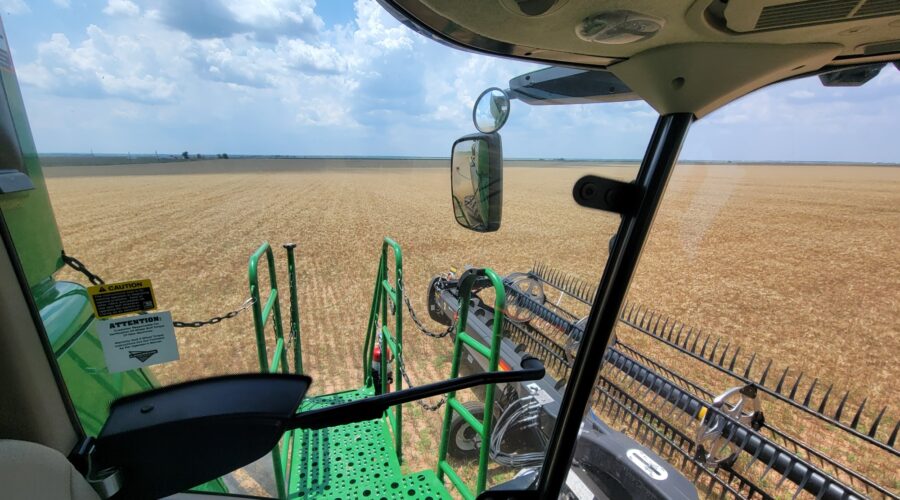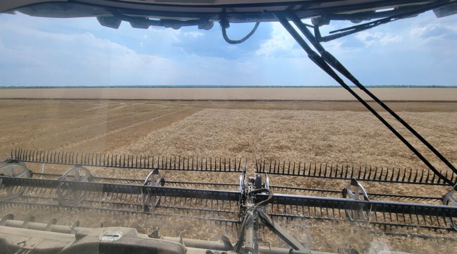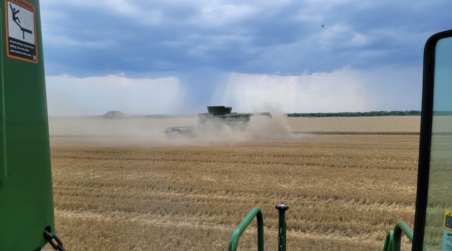 Southwest Oklahoma—We have been busy cutting wheat everyday but the cotton showers almost every evening are slowing us up. Four out of the past six evenings we’ve caught a little rain. A cotton shower is a rain that occurs on one field and a mile away the sun is shining. It’s a very frustrating situation for harvesters wanting to get wheat cut.