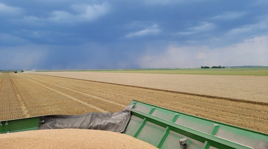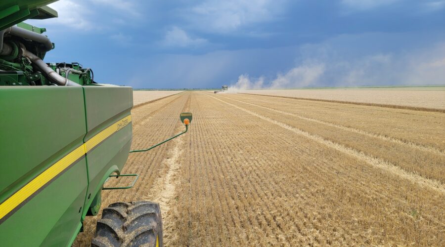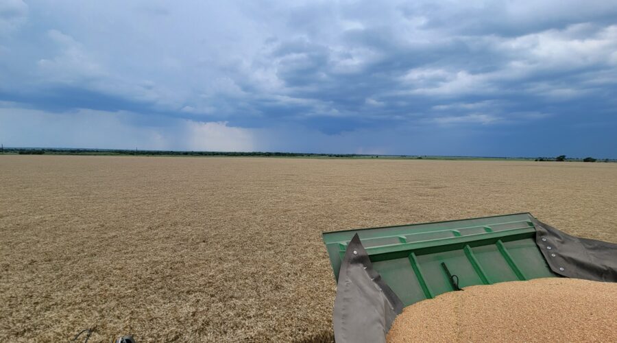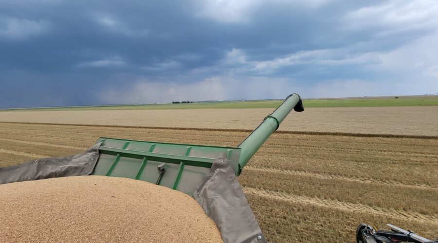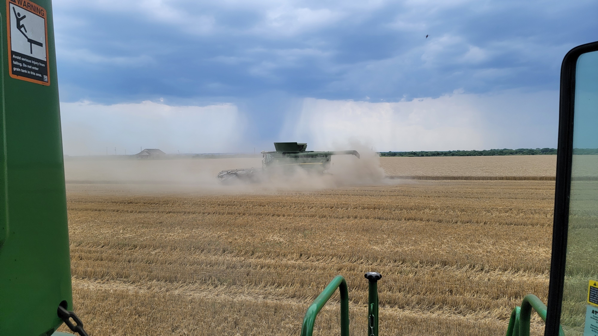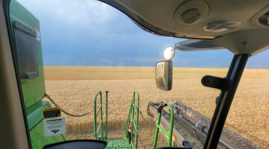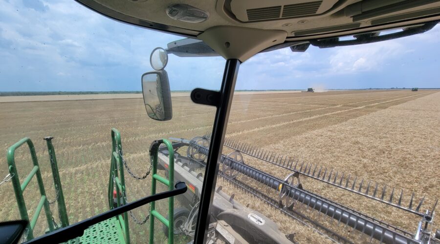 Southwest Oklahoma—We have been busy cutting wheat everyday but the cotton showers almost every evening are slowing us up. Four out of the past six evenings we’ve caught a little rain. A cotton shower is a rain that occurs on one field and a mile away the sun is shining. It’s a very frustrating situation for harvesters wanting to get wheat cut.