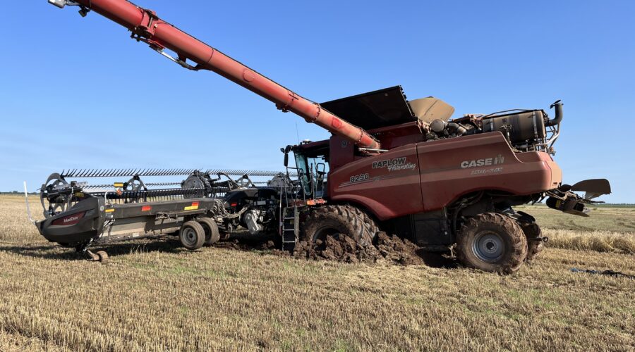 Kiowa, Kansas—More rain is making a challenging combination of humidity, weeds, and mud. It feels like as soon as you step outside, you are baking in an oven. The air is thick with moisture, which encourages weeds and keeps the wheat from drying enough to cut. We haven’t cut many acres this week due to these conditions. We also have been pulling machines out of the mud right and left. After all three machines succumbed to the mud a few nights ago, Paul decided to throw in the towel and wait for the sun to get everything out safely.
