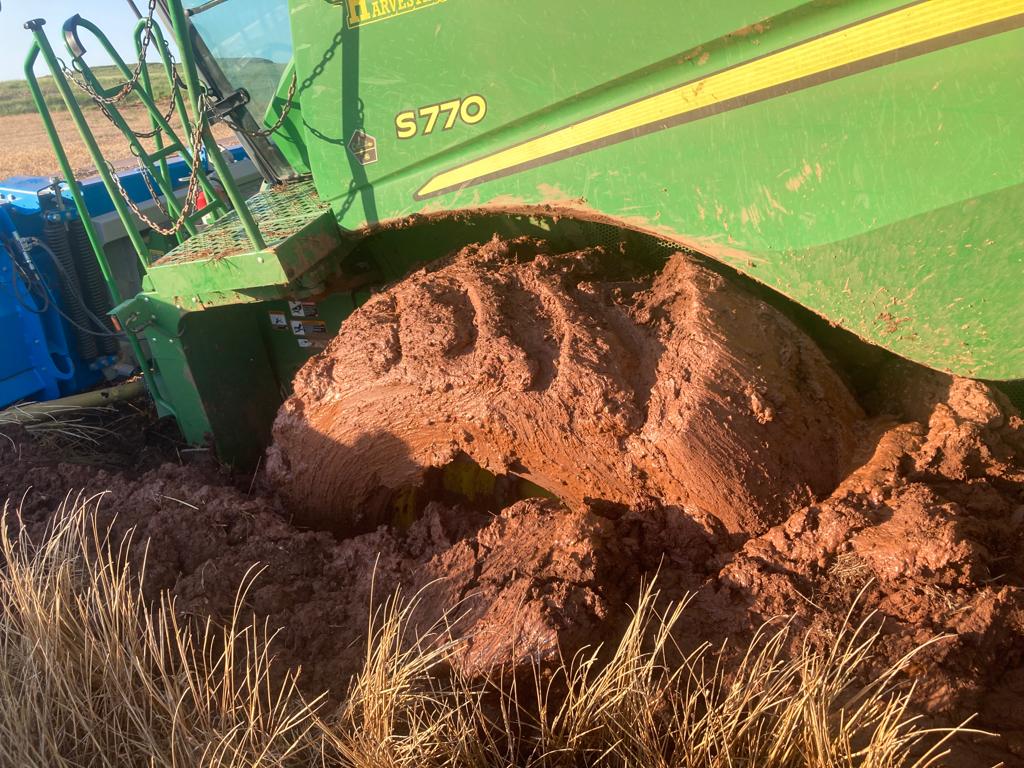 Considering how much rain this area had received in such a short period of time, and the lay of the land for our fields, we really do consider ourselves lucky that there was only one major moment like this. Yes, there were a few other minor ones but they were back up and running quickly. We were able to get all the wheat out on the entire farm except 15 acres. Under these tough conditions, that is a success story.
