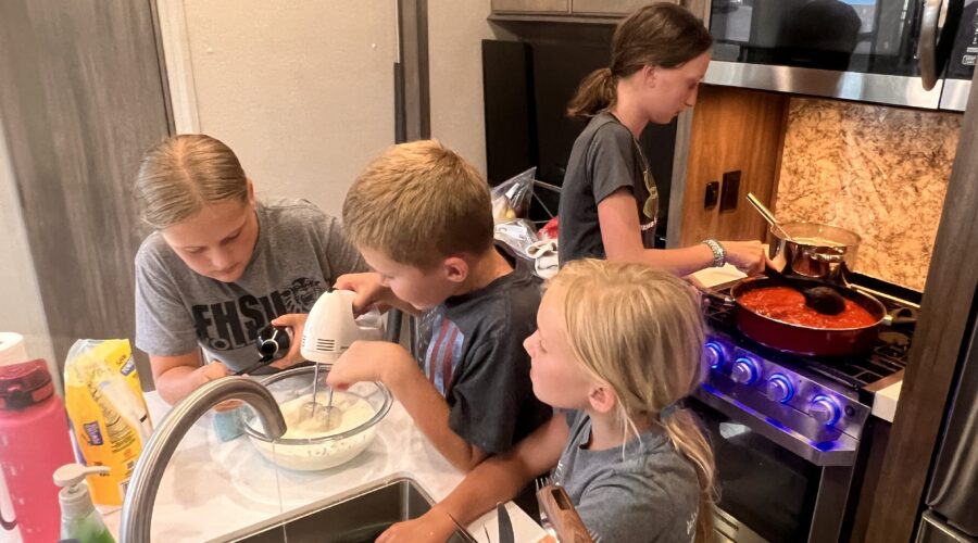 And speaking of supper, that night we had spaghetti, salad, breadsticks, and jello cake with homemade whipped cream. I threatened my sister-in-laws that I may keep their girls forever because the four cousins were some of the best kitchen help I’ve ever had. They divided and conquered the tasks and made speedy work of the entire thing.