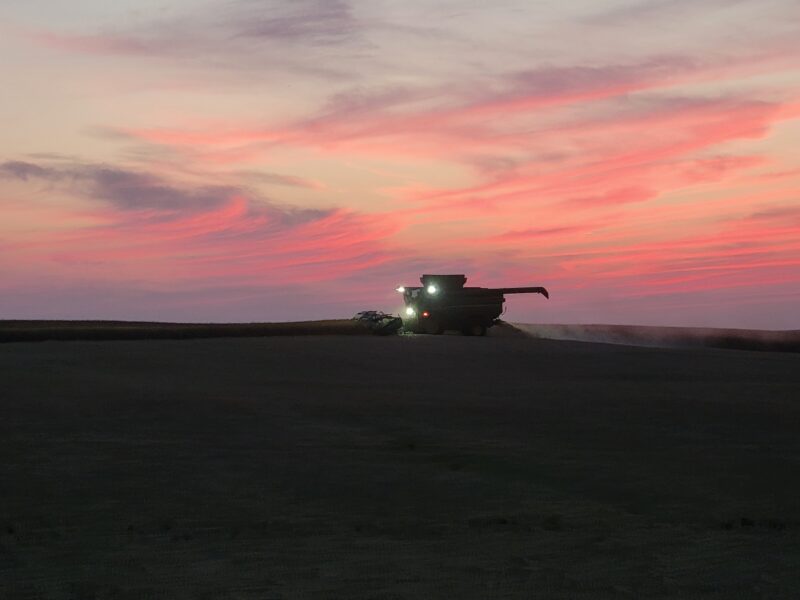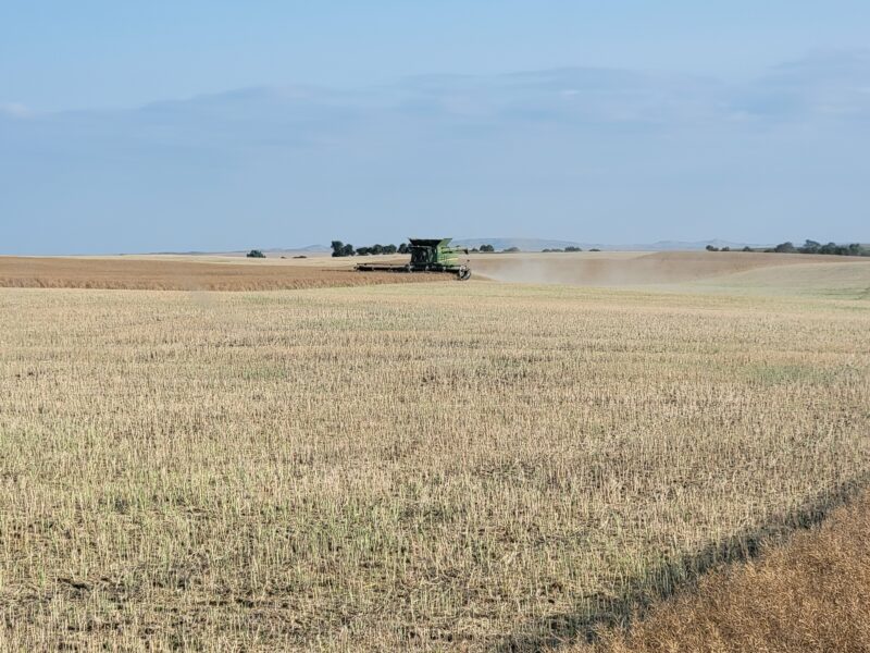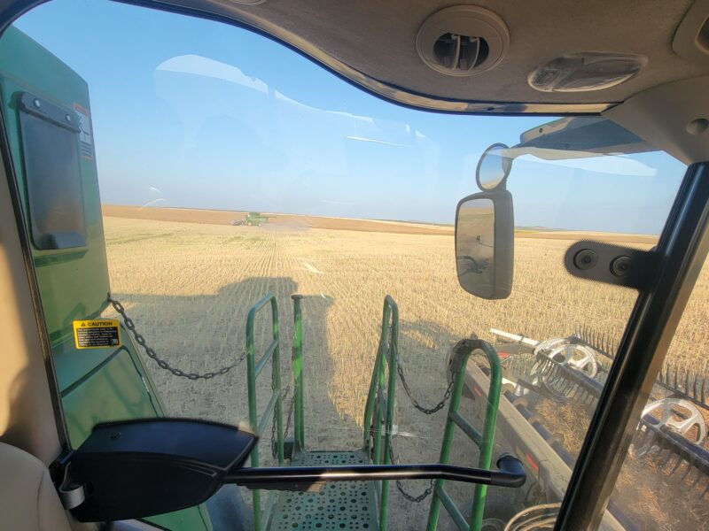 We have two combines here and seven in Montana, trying to get finished up. The radar shows they got rain today in Montana. I don’t hear from them or even hardly call them because we’re all in no phone zones. We’ve got a full crew, but I’m looking to add more drivers for fall. If interested, please apply online at schemperharvesting.com. Thanks!